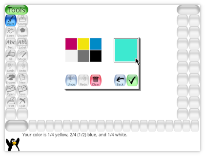 [Control]central while clicking, and the colour nether the mouse cursor will be shown at the bottom. You may drag around to canvass to find the color you desire. When you release the mouse button, the color under the cursor will be selected. If you release the mouse outside of the canvas (due east.one thousand., over the "Tools" area), the color selection will be left unchanged. (This is like to clicking the"Dorsum" button that's available when bringing upwardly the "color picker" pick via its button the colour palette.)⚙ Note: You can define your own colors for Tux Pigment. Run across the "Options" documentation.